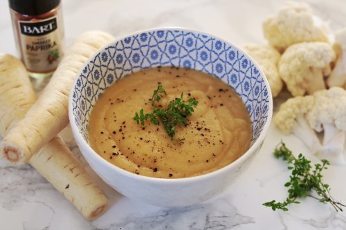 In our household we always have renaissance of a good old Sunday roast in the winter time. Last year we re-discovered a love of roasted parsnips. We all got pretty obsessed with them so started thinking about how else we could enjoy them. And who doesn't love a bowl of warming soup in winter time. It's so Hygee! Roasting the vegetables not only makes this dish super easy to put together (because you can literally just throw all of the veg into the oven rather than having to neatly chop it up) but the creaminess of the parsnip and the cauliflower with the sweetness of the roasted onion and depth from the paprika really makes this a delicious, bowl that all of us enjoyed - day after day!